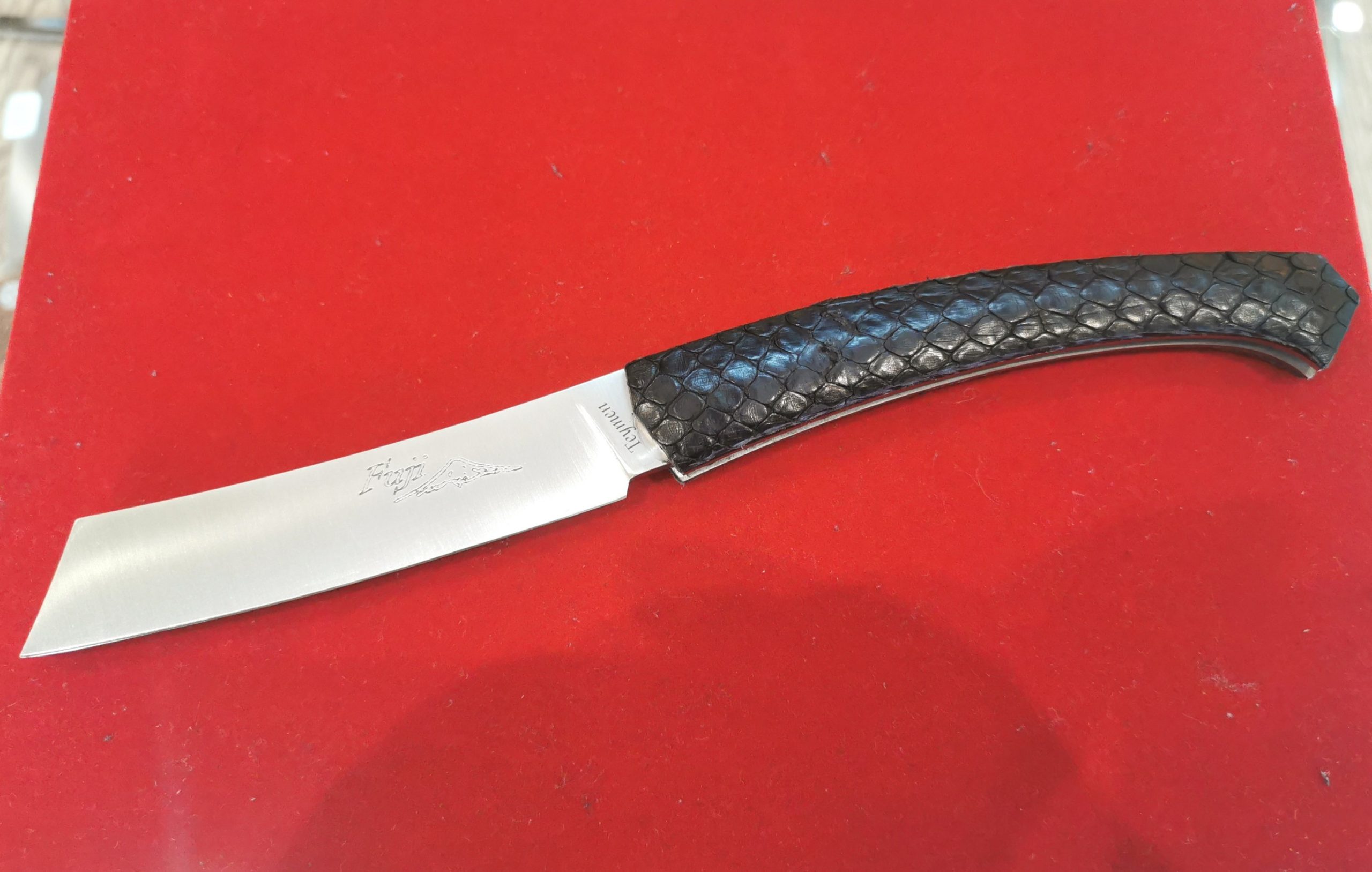 Type de cuir exotique élaboré à base d’écailles de crocodile véritable, matériau de luxe revêtant les manches des Fujis.